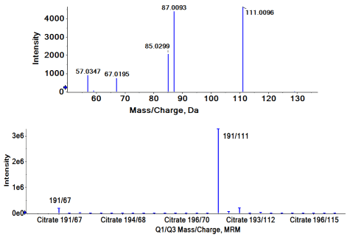 Figure 3. Comparison of scan methods. (A) MS/MS spectrum of citrate (m/z 191) from the TripleTOF 6600 System. All fragments of m/z 191, not only 191/67 and 191/111, are acquired on the TripleTOF 6600 System in a single MRMHR experiment. In total, 7 MRMHR experiments with precursor masses from 191 through 197 are required for full characterization of all isotopologues of citrate. (B) Q1/Q3 spectrum of citrate from the QTRAP 5500 System. Here, 27 MRM transitions of citrate parent/daughter combinations are required for full characterization of all citrate isotopologues.