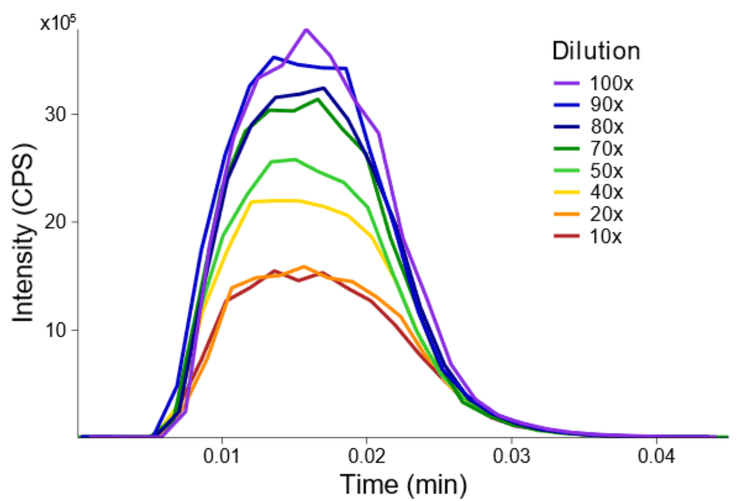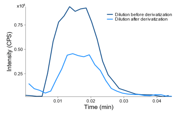 An issue commonly associated with direct-injection MS/MS (i.e., the absence of a chromatography step) is reduced sensitivity due to matrix components, hindering efficient ionization of the compound of interest19-20 . However, we observed that ionization efficiency and signal intensity could be drastically improved by choosing an appropriate dilution strategy, both in terms of ratio and timing during the derivatization reaction. Different dilutions of a reference sample were measured to determine which dilution level was optimal for achieving the highest possible signal intensity (Figure 3). In general, a higher dilution ratio resulted in higher signal intensity. However, to obtain good technical repeatability, we opted for a 1:50 dilution ratio since this dilution allows more accurate pipetting during sample preparation while preventing the loss of acetaldehyde due to evaporation as much as possible. Furthermore, a 1:50 dilution ratio still allows the detection of acetaldehyde concentrations on the lower end of the spectrum, since higher dilution ratios could push the fermentation samples below the detection limit of the system.