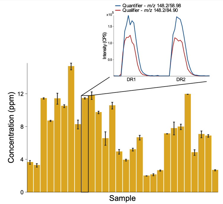 A 1:50 dilution of the samples was needed to overcome reduced sensitivity because of matrix components. Therefore, the measured acetaldehyde concentrations are low, ranging from ppb to low ppm values. However, the need for dilution does not pose an issue because of the system’s high sensitivity for the compound, thus being able to detect these low concentrations accurately.
