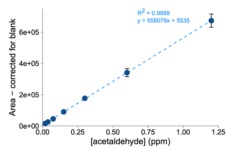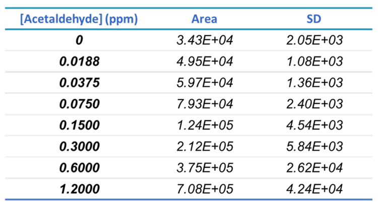 - The combination of the system’s sensitivity and sample dilution protocol supports measurements of acetaldehyde concentration over a wide linear range with limited matrix effects.