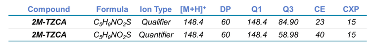 Mass spectrometry: Data were acquired on a SCIEX Triple Quad 6500+ system using an MRM method that measured 2 transitions in positive ion mode. One transition was used to quantitate the cysteinylated aldehyde (quantifier ion), while the other transition was monitored simultaneously to ensure correct identification of the analyte (qualifier ion) 13,16,17. The spray voltage was set to 4000V, and the source temperature was 350°C. Ion source gas 1 was 90 psi, gas 2 was 70 psi. The curtain gas was 30 psi. MRM transitions and compound-specific parameters that were used, such as collision energy (CE), declustering potential (DP) and cell exit potential (CXP), are listed in (Table 1).