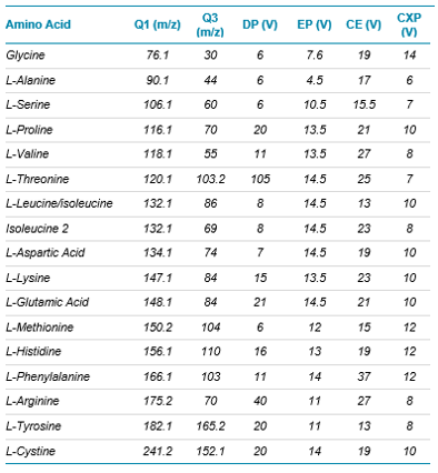 The method described here allows rapid, robust and sensitive quantitation of 17 amino acids without derivatization. Use of the MIDAS workflow, unique to QTRAP Systems, allows unambiguous analyte identification. The method has been successfully applied to the quantitation of amino acids in a sample of PBMC cell supernatant.