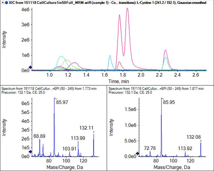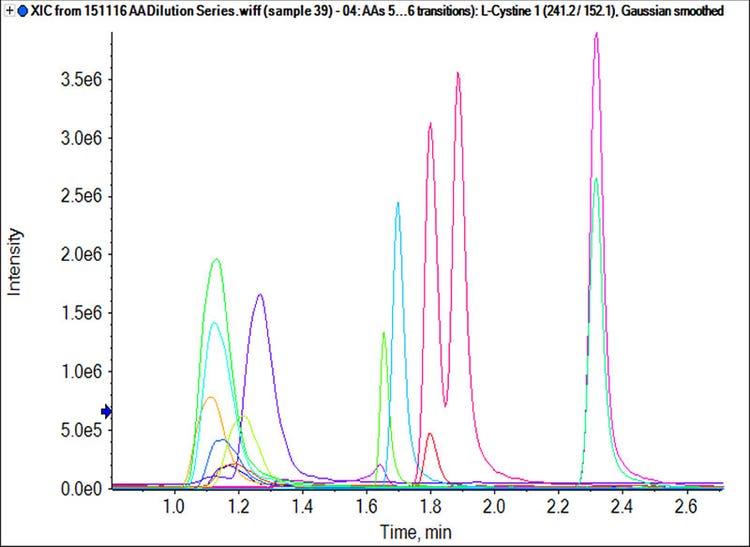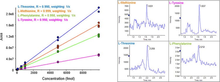 MRM extracted ion chromatograms for four amino acids at concentrations close to their limits of detection (LODs), and corresponding linearity data, are shown in Figures 3 and 4, respectively. LODs were calculated for 17 amino acids, and their concentrations measured in diluted PBMC cell supernatant (Table 2).