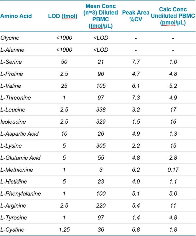 MRM extracted ion chromatograms for four amino acids at concentrations close to their limits of detection (LODs), and corresponding linearity data, are shown in Figure 3. LODs were calculated for 17 amino acids, and their concentrations measured in diluted PBMC cell supernatant (Table 2).