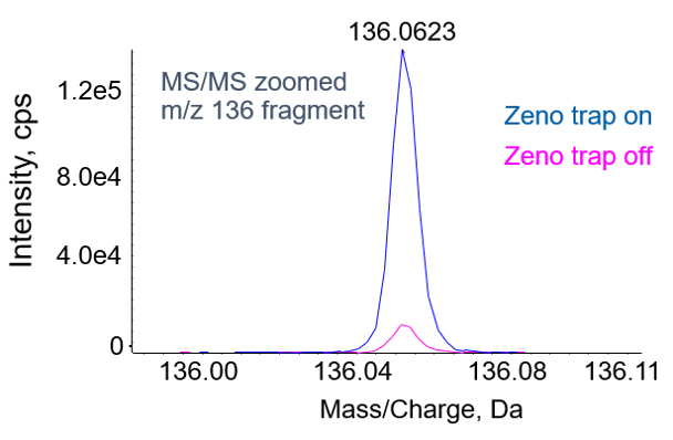- MS/MS XIC peak area gains of ~13 fold with Zeno trap activated for high‑sensitivity quantification of detected metabolites