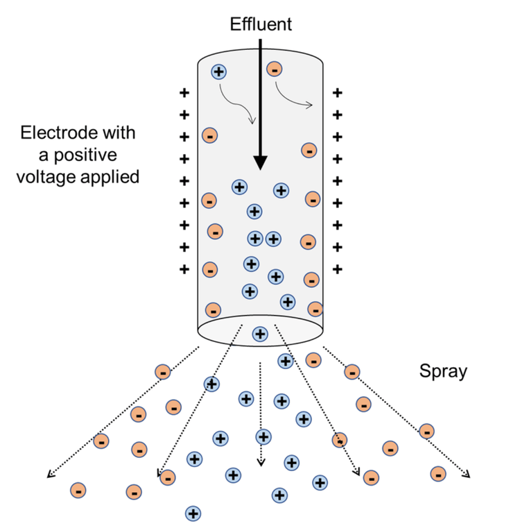 Spray voltage. Typically, the ESI voltage is set at or near its maximum. It is essential to recognize that during ionization, both positive and negative ions are produced (conservation of charge). If a positive voltage is applied (for example, in positive ion mode), positive ions will migrate toward the center of the effluent stream and negative ions will migrate toward the walls of the electrode (Figure 4). When the spray is created, the plume is not homogenous. Negative ions will be at the outside edges of the plume and positive ions will be at its center. This segregation of the ions makes it essential to always adjust the position of the probe on the ZenoTOF 7600 system. The position of the OptiFlow Turbo V ion source does not need to be adjusted, however, because its geometry is already optimized. Other key source parameters include the nebulizing gas (GS1), which affects droplet size, and the drying gas (GS2), which evaporates the solvent to generate gas-phase ions. Subtle changes in either or both parameters can affect instrument sensitivity. In samples with heavy matrix contamination, as is common in metabolomics experiments, one can slightly lower the ESI voltage to reduce the ionizing species that come from the matrix. With a high voltage setting, highly ionizable species in the matrix may crowd out the lower ionizable species and suppress the analyte signal.