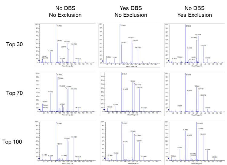 The comprehensive dataset shown in Table 1 is separated into 4 sections, divided by the darker lines within the table. Each section shows 8 experiments that were performed in the positive ion mode, in which the maximum number of candidate ions was varied from the top 30 to 100 candidates. The 4 sections differ by whether DBS and/or exclusion criteria were applied. Each variable and its effects on the data are discussed below. For this type of experiment, no advanced IDA criteria parameters are used.