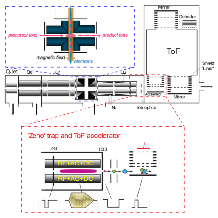 The Zeno trap functions by trapping ions generated by EAD- or CID-based fragmentation. The Zeno trap is not used during TOF MS scans because the ion current is already attenuated via ion transmission control (ITC) and the likelihood of detector saturation is high. Once the ions are trapped (t < 1 ms), they are sequentially scanned from the trap to the TOF accelerator in a mass-dependent manner. High molecular weight ions are scanned out first and are followed by lower molecular weight ions, such that they all arrive at the TOF accelerator at the same time. This eliminates the mass intensity bias that results in other instruments only taking a portion of the fragment ions. Once the ions are accelerated into the TOF, the Zeno trap fills and repeats the cycle. This process improves the instrument duty cycle and ~90-95% of all fragment ions hit the detector.