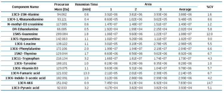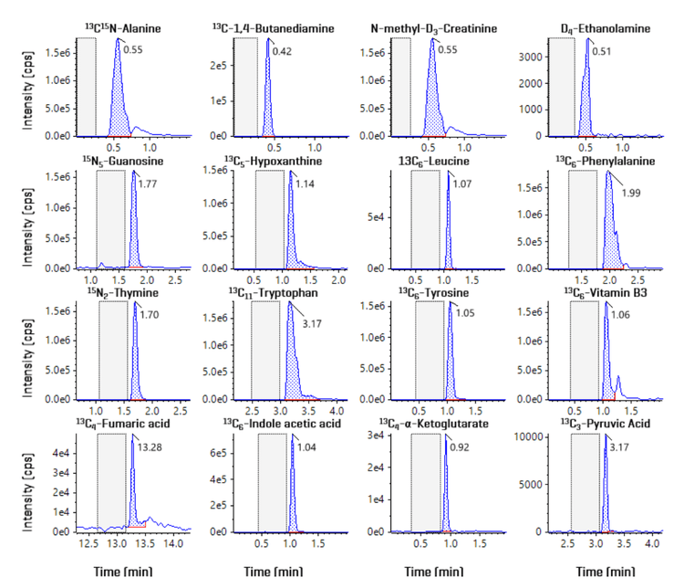 Sample preparation: NIST SRM 1950 plasma was extracted with 4 volumes of ice-cold methanol and vortexed for 10 s. A 1:10 volume equivalent of QReSS internal standards to plasma was added, and the sample was vortexed for 10s. The mixture was allowed to rest for 1 hr at 4 ºC, vortexed again for 10 s, centrifuged at 15,000 × g for 10 min, and the supernatant was decanted. The supernatant was dried under a stream of nitrogen, and the metabolites were resuspended in water containing 0.1% formic acid to a final concentration of 1 µL of extract per 0.2 µL of plasma equivalents. The solution was directly analyzed by high-performance liquid chromatography electrospray ionization tandem mass spectrometry (HPLC-ESI-MS/MS) using a 0.5 µL plasma-equivalent on-column injection (2.5 µL injection). The QReSS internal standards (Vial 1) were purchased from Cambridge Isotope Laboratories, and the stock solutions were prepared according to the manufacturer’s instructions [8].