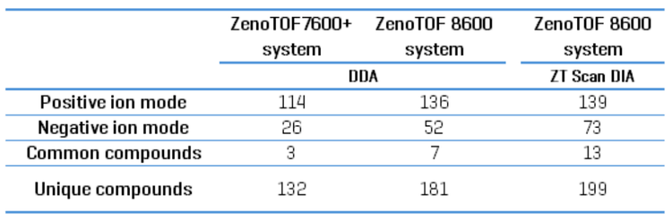 The value and strength of untargeted metabolomics come from its ability to identify molecules in complex biological matrices. The quality of an experiment is assessed by metabolite coverage, which depends heavily on the instrument's speed, sensitivity, linear dynamic range, and the precursor ion selection criteria. The ZenoTOF series of instruments features a detector that processes signals at 133 Hz. In practice, this speed corresponds to ~ 100 MS/MS events per second while maintaining a constant mass resolution of >35K. This speed enables DDA experiments to be designed with more dependent scans, which generally translates into better coverage. Here, a Top 50 strategy was used, previously identified as optimal for the ZenoTOF 7600 system [9]. Zeno trap pulsing improves the instrument duty cycle to >90%, thereby dramatically increasing sensitivity. For the ZenoTOF 7600+ system, the instrument sensitivity is ~10X higher than that of previous-generation QTOF instruments, and the ZenoTOF 8600 system is ~ 10X more sensitive than the ZenoTOF 7600 system. Greater sensitivity enables better detection of low-abundance molecules, with the ZenoTOF 8600 system achieving the best coverage.