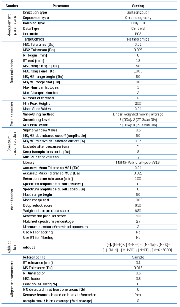 Data processing: Data acquired from DDA and ZT SCAN DIA experiments were processed using MS-DIAL 5.6.082520-alpha software, which will be referred to generically as MS-DIAL 5.6 in this report. This version of MS-DIAL, available at the MS-DIAL website (https://systemsomicslab.github.io/compms/msdial/main.html), was adapted from the MS-DIAL 5.5 versions to process ZT SCAN DIA data.