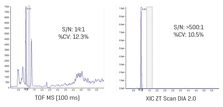 A visual comparison of the differences between quantitative analysis of compounds using DDA (TOFMS level) and ZT Scan DIA (TOF MS/MS level) is shown for pseudouridine (Figure 5). The left panel displays the XIC from a survey TOFMS scan, which is typically used for quantitation in DDA experiments. The baseline is high, indicated by the low signalto-noise ratio (S/N), and several other peaks co-isolate within the 10 mDa mass window of pseudouridine. The right panel shows the XIC from ZT Scan DIA MS/MS data, with only one major peak, exhibiting much higher S/N than the TOFMS XIC.