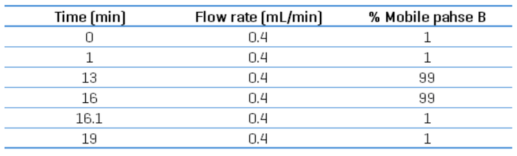 Chromatography: Samples were analyzed using an Exion LC system with an Acquity Premier CSH Phenyl-Hexyl column (1.7 µm, 2.1 x 100 mm; Waters). Mobile phase A was 0.1% formic acid in water, and mobile phase B was 0.1% formic acid in methanol. A simple linear gradient from 0 to 99% B was used at a flow rate of 0.4 mL/min. The HPLC rinse solvent was water/methanol/iso-propanol/acetonitrile (1:1:1:1, v/v). The gradient conditions are shown in Table 1. A 2.5 µL injection was used (0.5 µL plasma equivalents), and the column temperature was maintained at 50°C. The total runtime was 19 min.