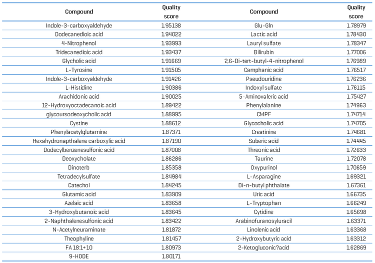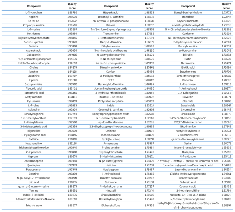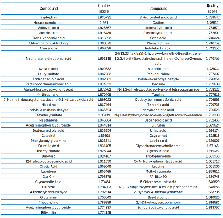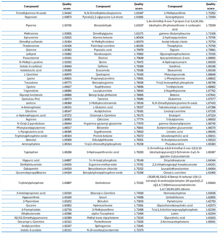 Upon close inspection, the initial DDA results obtained directly from MS-DIAL 5.6 [summarized in Table 4] contain duplicate entries due to inconsistent nomenclature in the compound database. The results also include complex lipids (e.g., PC, LPC, and PE) for which the extraction procedure was not optimized and were not the primary targets in these metabolomic studies. Consequently, complex lipids, phthalates, and duplicates were removed from the list of reference-matched compounds. Additionally, metabolites with quality scores below 1.6 were excluded. To further improve confidence, each qualified compound was manually inspected in MS-DIAL 5.6 and/or SCIEX OS. After curation, the initial set of 258 reference-matched compounds was reduced to 181 unique compounds (Table 5). These compounds are listed in Table 6 (positive ion mode) and Table 7 (negative ion mode). The compound names with their respective quality scores are provided. In some cases, compound names provided by the processing software were simplified or corrected for spelling.