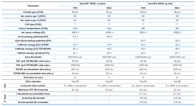 Mass spectrometry: Metabolomics analysis of NIST SRM 1950 plasma extracts was performed using two instruments: the ZenoTOF 7600+ and 8600 systems. Instrument calibration was maintained using the automated calibrant delivery system (CDS), which calibrated every five samples with an ESI calibration solution specific to the positive- or negative-ion mode (ZenoTOF 7600+ system) or with the new universal calibration solution for both modes (ZenoTOF 8600 system). DDA and ZT Scan DIA experiments were performed using collision-induced dissociation (CID) in the positive- and negative-ion modes. Instrument parameter settings are listed in Table 2.