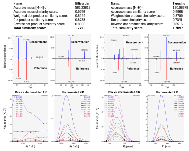A similar figure is shown for the ZT Scan DIA analysis in negative ion mode (Figure 4), with the compounds biliverdin and tyrosine highlighted. As shown in the positive ion mode, the panels demonstrate the power of Q1 deconvolution to improve the quality of metabolomics data and subsequent identification.