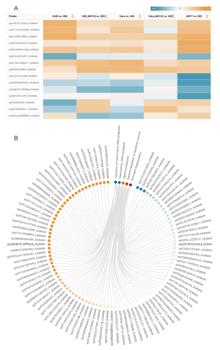 The DIA Results app enables exploration of differential proteins and their associated fold-changes in the form of volcano plots, heat maps and ontologies. Here, a SWATH DIA data set from the TripleTOF 6600+ system consisting of six different cell lines was processed in DIA-NN software. Results were imported into OneOmics suite to browse protein fold changes relative to a specified control. Heat maps enabled rapid visualization of differential proteins and their associated fold changes (Figure 4) and can be custom-filtered by fold-change confidence and reproducibility metrics. Ontology plots are also provided to correlate differential proteins to biological process, molecular functions, and cellular components. The dot beside each ontology term illustrates the direction and ratio of the fold change for the ontology term as determined from the associated proteins. Additionally, PCA scores plots are provided to illustrate sample clustering pre- and post-normalization, along with metrics illustrating ion library coverage (Figure 5). The visualizations provided in the DIA Results app facilitate interpretation of biological studies processed using DIA-NN software.