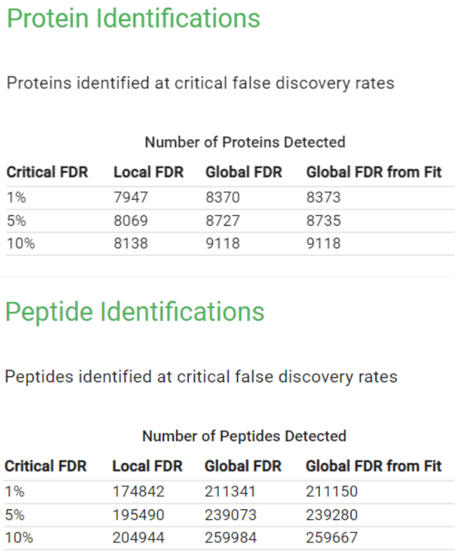High-pH fractions of K562 cell lysate digest were analyzed using Zeno DDA and processed using the Ion Library app in the OneOmics suite. The Ion Library app is an extension of ProteinPilot app and uses both the Paragon Algorithm and Pro Group Algorithm to infer peptides and proteins from DDA data. The app creates ion libraries in the *.txt file format for DIA data processing with are compatible with DIA-NN software. Additionally, *.groupexport files are created that can be explored in the ProteinPilot app to assess overall protein and peptide identifications and underlying data quality. The final K562 digest library contained 8,373 proteins at <1% global FDR and 211,150 peptides at <1% global FDR (Figure 2). For each spectral library created in OneOmics suite, a record of analysis settings is saved to help users reproduce their processing results.