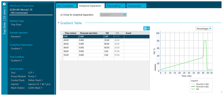 For the 20- and 45-minute gradients, the gradient was from 3% B to 35% B, followed by a 1-minute ramp to 80% B, a 2-minute wash at 80% B, a ramp down to 3% B over 1 minute and a 6- minute re-equilibration. Figure 3 shows the gradient table and graph for the 45-minute gradient method programmed in SCIEX OS software.