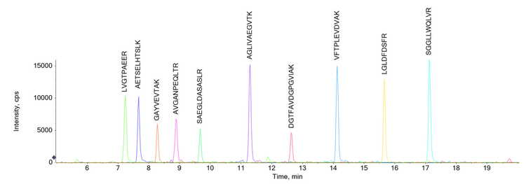 Sample preparation: Human K562 cell lysate tryptic digest was acquired from Promega and a 10 ng/µL dilution was prepared in water with 0.1% formic acid. A mixture of 20 isotopically labeled synthetic peptides (PepCalMix, MS Synthetic Peptide Calibration kit, SCIEX) was added to a final concentration of 0.5 fmol/µL for each.
