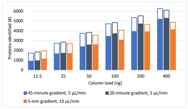 - At low sample loads, the 5-minute gradient method enabled the identification and quantitation (CV <20%) of more protein groups, compared to the 20-minute or 45-minute gradients