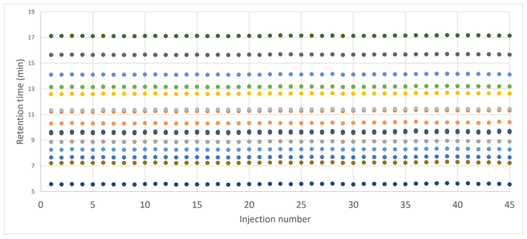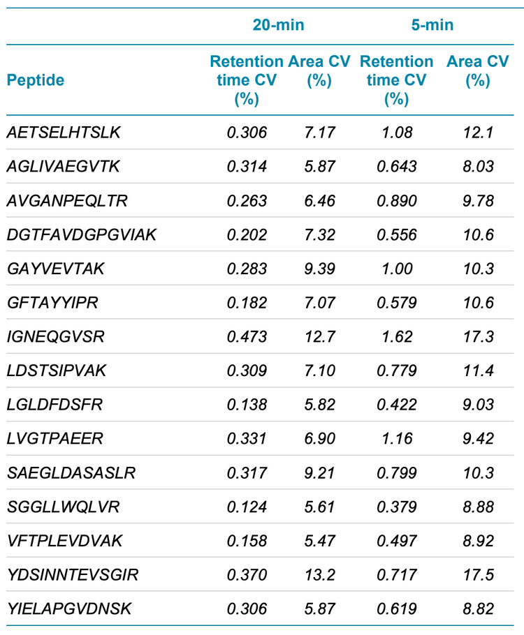 - Excellent retention time (CV <0.5%) and peak area (CV <13%) reproducibility were observed for peptides tracked across 45 replicate injections with a 20-minute gradient method