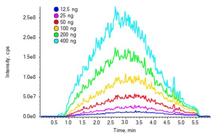 Figure 4 shows the total ion chromatograms (TICs) for the different injected amounts of K562 digest using the 5-minute gradient. Figure 1 summarizes the number of protein groups identified and quantified with a CV <20% in at least 2 of 3 replicates for the different gradient lengths and sample loads. For the 400 ng sample load, the 45-minute gradient resulted in the most identifications (6,253 protein groups), although the number of identified protein groups was similar to the 20-minute gradient (6,099). With the 5-minute gradient, 4,858 protein groups were identified. This is 78% of the number measured for the 45-minute gradient but the throughput was more than 8 times higher, as the total cycle time for the 5-minute gradient was 7 minutes. At the lowest (12.5 ng) load, the most protein groups were identified with the 5-minute gradient. This is likely due to the narrow chromatographic peaks and short column that result in spectra with better S/N ratios for the at this low injected amount. Approximately 83-86% of the identified protein groups at the 400 ng load could be quantified with a CV <20% using the different methods. In comparison, ~50-58% of protein groups were quantifiable with a CV <20% at the lowest 12.5 ng load.