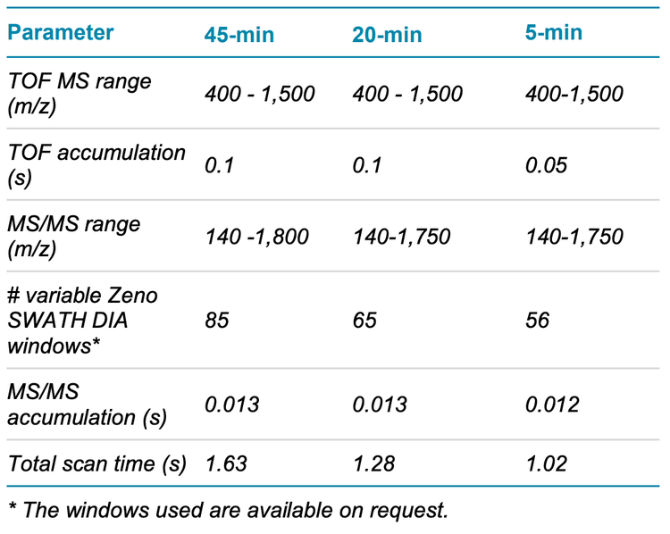 Mass spectrometry: The ZenoTOF 7600 system was operated in positive mode using the OptiFlow Turbo V ion source with a microflow probe and 1-10 µL/min electrode. The source conditions were Gas 1 60 psi, Gas 2 20 psi, curtain gas 35 psi and temperature 225°C. The electrospray voltage was 4,500 V at 5 µL/min and 5,500 V at 10 µL/min. The Zeno SWATH DIA parameters used with the different gradients are listed in Table 1. The declustering potential was 80 V, CAD gas was 7 and time bins to sum was set to 8 for all gradients. The collision energy for TOF MS was 10 V. For MS/MS, the dynamic collision energy for charge state 2 was used.