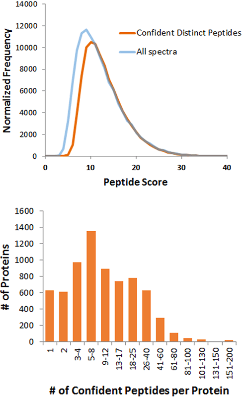 The quantity and the quality of the MS/MS spectra acquired is also key for identifying as many peptides and hence proteins from the sample. The quality of the MS/MS spectrum acquired can be reflected in the score from the subsequent database search. Here, the score distribution (Figure 4, top) indicated that the majority of MS/MS spectra acquired were of high quality, score of 8 or more (blue). When the distribution for the MS/MS spectra that resulted in a confident peptide ID is plotted you can see a slight shift of the distribution to higher score. This shows that the overall quality of most spectra is very good. Combined with the large search space covered by ProteinPilot Software, 83% of spectra collected was matched to the proteins / peptides at 1% global FDR. This means many confident peptides are identified for each protein as reflected in Figure 4 (bottom). The majority of proteins have 2 or more peptides identified for higher confidence.