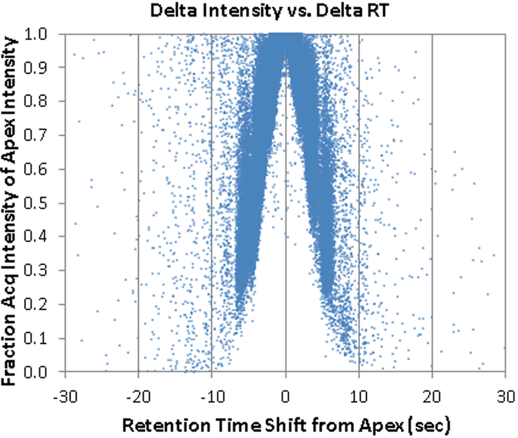High quality analytical separation is also important for good identification rates and this is easily obtained using microflow LC. The median peak with on the analytical column was 7.2 seconds at half height. As this is data dependent acquisition, the point at which MS/MS is triggered on each LC peak can be variable and this will impact the resulting intensity / quality of each spectrum. However when peak shape is sharp it is more likely that an MS/MS will be collected closer to the LC peak apex where intensity is best, this was the case in this study as indicated in Figure 3. Here the point of MS/MS acquisition relative to the LC peak apex is plotted and shows that 90% of MS/MS spectra are collected at 50% peak height or greater.