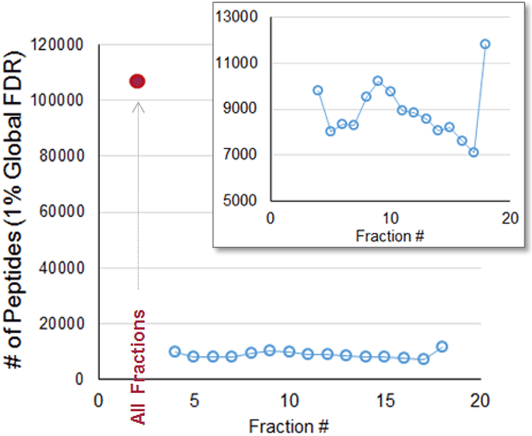 The complexity of proteomic digests is extremely high therefore good fractionation in the first dimension is critical when the goal is deep protein identification. Using high pH fractionation in the first dimension, good even peptide separation was obtained (Figure 2) with ~9000 peptides identified in each fraction. Peak separation was also good as only about 25% of peptides were found in multiple fractions, providing 106849 distinct peptides in total.