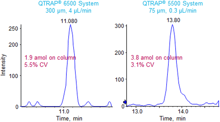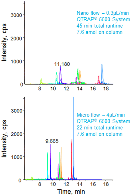 Mass Spectrometry: Nanoflow LC experiments were performed on the QTRAP 5500 System with NanoSpray® Source. Microflow LC experiments were performed on the QTRAP 6500 System with IonDrive™ Turbo V Source with 25µm ID hybrid electrodes. MRM transitions were optimized for each peptide and used on both instruments. Standard concentration curves were performed to evaluate impact of flow rates and separation times on the two different MS systems. All samples were analyzed in triplicate.