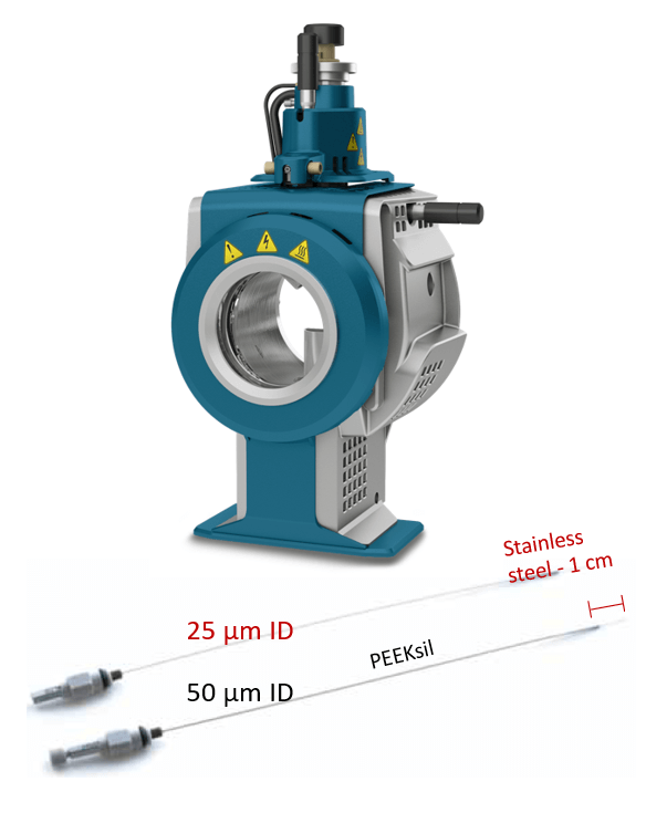 When moving to higher flow rates on the QTRAP 6500 System, the IonDrive Turbo V Source provides high efficiency ionization and increased ruggedness (Figure 2). For best performance at microflow rates, the sources are plumbed with the hybrid electrodes specifically designed for microflow. These electrodes significantly reduce post column dead-volume for reduced dispersion and sharper peak widths. In this work, the 25 µm ID electrode was used, which is ideal for 300 µm ID columns and a flow rate range from 3 – 25 µL.