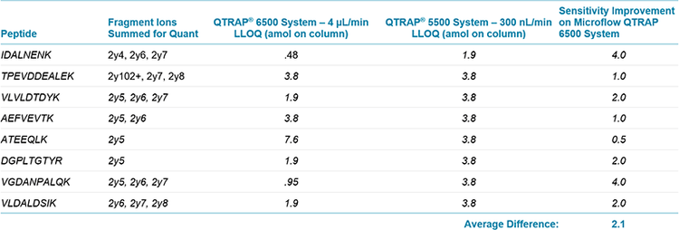 Previous work explored the difference in sensitivities between different nano and micro flow rates by performing standard concentration curves on a set of tryptic peptides.1 It was found that there is roughly a 3x loss in sensitivity when moving from nanoflow to the higher 4 µL/min microflow rate. Other peptide quantitation studies have measured a roughly 3-5 fold increase in sensitivity when moving from the QTRAP 5500 System to the QTRAP 6500 System. From these two studies it was hypothesized that nanoflow rate peptide quantification assays currently performed on the QTRAP 5500 System could be moved to microflow on the QTRAP 6500 System, resulting in similar sensitivities but with improved robustness and increased throughput.