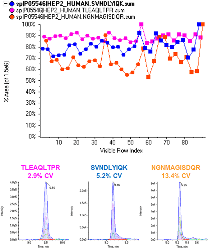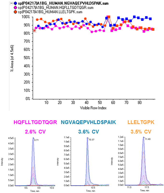 A range of peptides were included in the MRM assay so the digestion protocol could be optimized for overall high performance. Many peptides to specific proteins showed very high reproducibility with % CVs ~ 2-3% across the 32 wells (Figure 4). Here, 3 peptides to Alpha-1-B glycoprotein (A1BG) were monitored and very high digestion reproducibility was observed (NGVAQEPVHLDSPAIK - 3.6%, HQFLLTGDTQGR – 2.6%, LLELTGPK – 3.5%).