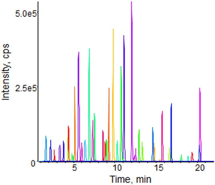 Mass spectrometry: The MRM analysis was performed on a QTRAP® 6500 System (SCIEX) equipped with an IonDrive™ Turbo V Source. For the microflow experiments, the 25 μm I.D. electrospray probe (SCIEX) was used. SWATH Acquisition was performed using a TripleTOF® 5600 System equipped with a DuoSpray™ source (SCIEX) and a 25 μm I.D. electrospray probe (SCIEX).