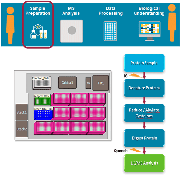 There are many steps in the process to generating high quality proteomics data on biological samples. There are now powerful MS workflows for quantitation (MRM and SWATH® Acquisition) that enable highly reproducible quantitation on small or large numbers of samples. This creates a new bottleneck in sample preparation, the ability to reproducibly generate digested proteomic samples is critical for performing protein quantitation studies (Figure 1, top).