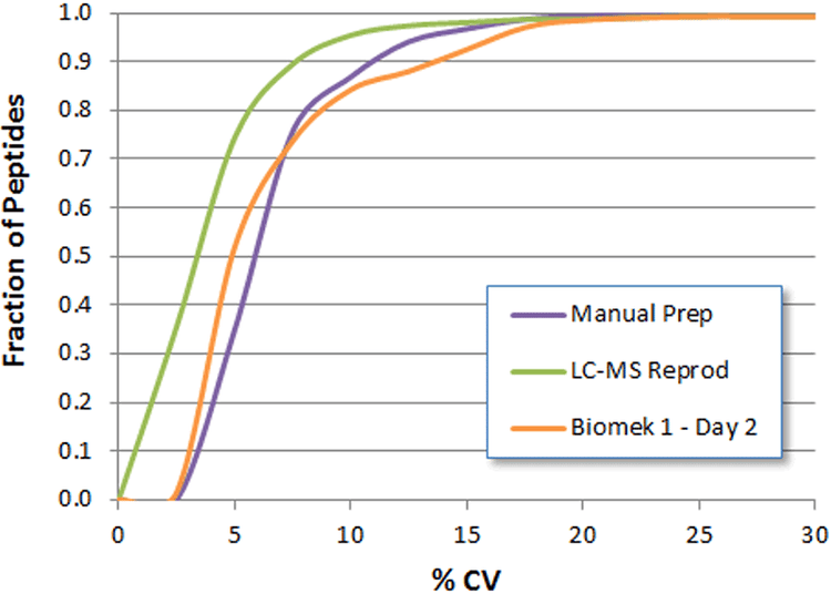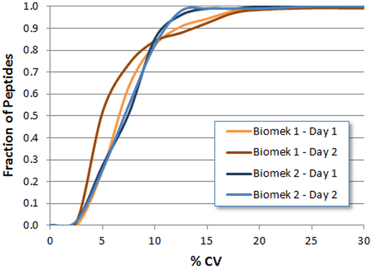 Here, an automation solution for the protein digestion portion of sample preparation has been developed to provide high reproducibility on small or large numbers of samples. For the plasma samples tested in this study, very high digestion reproducibility was obtained, with more than 80% of peptides monitored having reproducibility better than 10% CV (Figure 3). This reproducibility was then demonstrated on multiple automation workstations on multiple days (Figure 6). This work demonstrates a reproducible automated solution for protein digestion, useful for both smaller proteomic studies within a lab and also larger scale proteomics studies across labs.