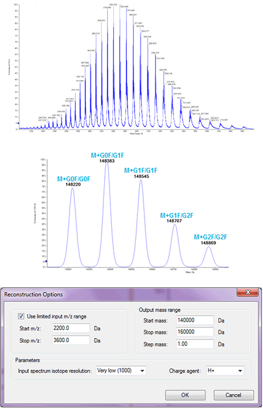 - Determine the intact molecular weights of proteins, peptides, oligonucleotides, mAbs, and other biomolecules using the mass reconstruction tools and either a charge series or isotope series in positive ion or negative ion mode