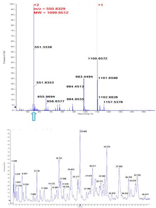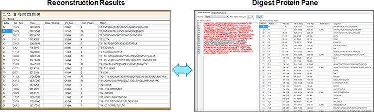 With the manual reconstruction workflow, users have the choice to deconvolute based upon a charge series or isotope series. For a manual reconstruction based upon an isotope series, the user simply selects multiple isotopes of the ion of interest and the tool will calculate the intact molecular weight and annotate the spectrum (Figure 2, top). Peptide masses can also be automatically determined from LC-MS (Figure 2 bottom) by using the LC-MS Reconstruct algorithm. Reconstruction is performed across the chromatographic run, peptide masses are computed and a table of masses is created for use in downstream workflows such as peptide mapping (Figure 5).