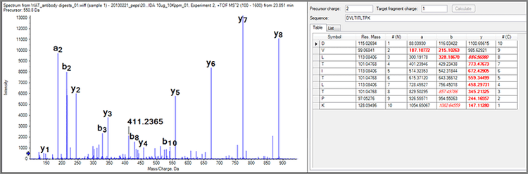 If an LC-MS/MS workflow was used, the MS/MS data for any matched peptides can be compared with their sequence using the Peptide Fragment pane. As with the Sequencing workflow, all fragment ion matches are highlighted in the table and annotated in the spectrum (Figure 4).