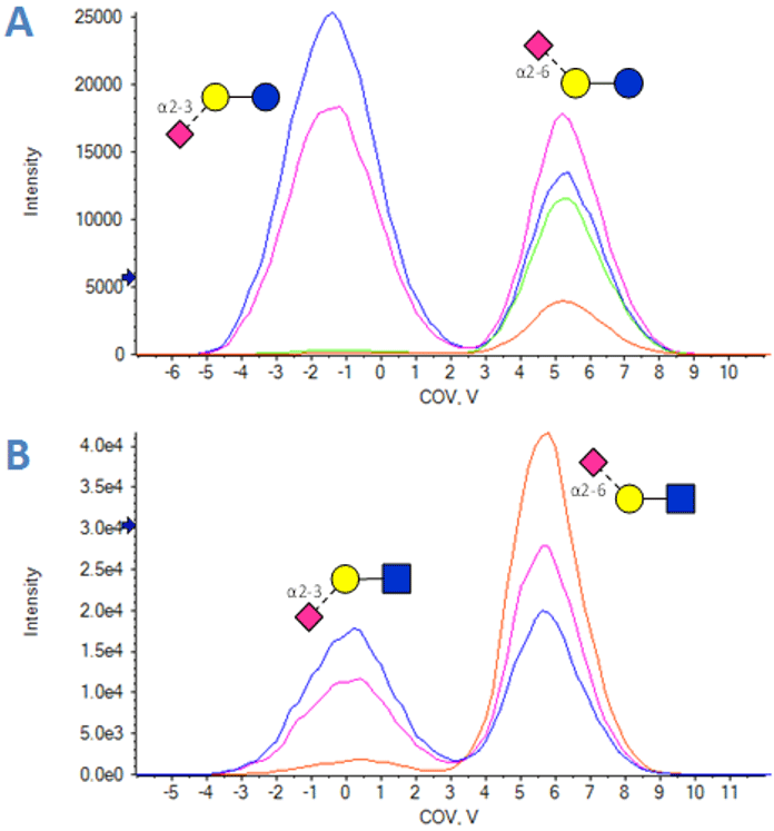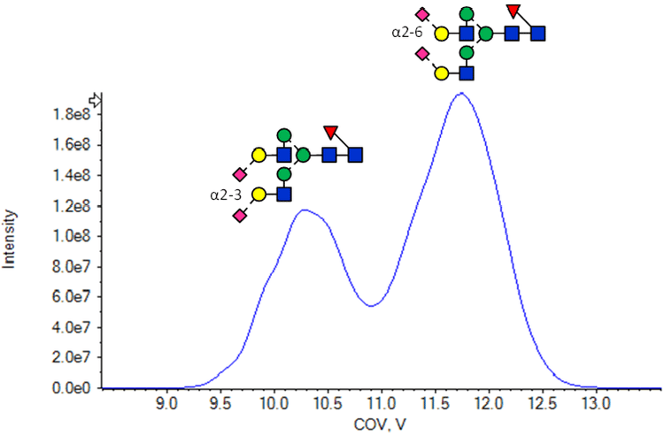 This study explores the selectivity of DMS for the resolution of isobaric glycan species containing α2,3- and α2,6-linked sialic acid. The ability to separate glycans based on this linkage was demonstrated with both small glycans (Figure 3) and large glycans (Figure 1).