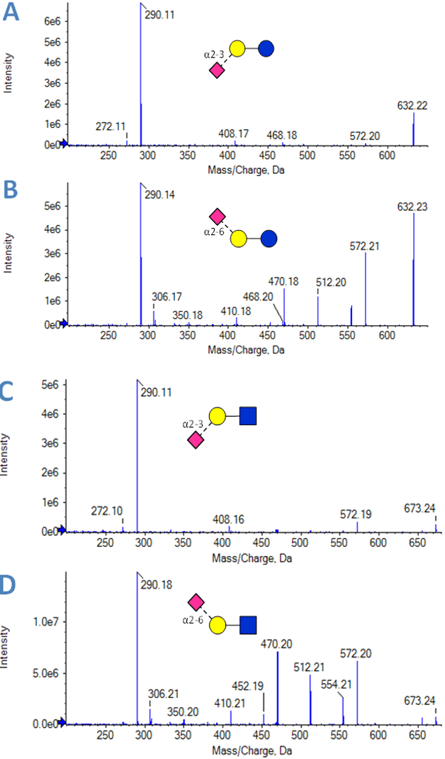 Protein glycosylation is one of the most common and yet most complex post-translational modifications, displaying diversity both in site occupancy and in glycan structure. Sialic acids are typically found at the outermost ends of glycan chains, and have important function in many physiological and pathological processes, including pathogen binding and regulation of the immune response.1 In human cells, the linkage position of a sialic acid to a glycan side chain can be α2,3 or α2,6 to a galactose residue, α2,6 to a N-acetylgalactosamine (GalNAc) residue, or α2,8 to another sialic acid residue.2,3 The linkage configuration has important consequences for biological function, for example, upregulation of α2,3 linked sialic acid is associated with metastasis progression in certain cancers.4,5 For the development of biopharmaceuticals, characterization of sialylation is essential for determination of function and efficacy.6