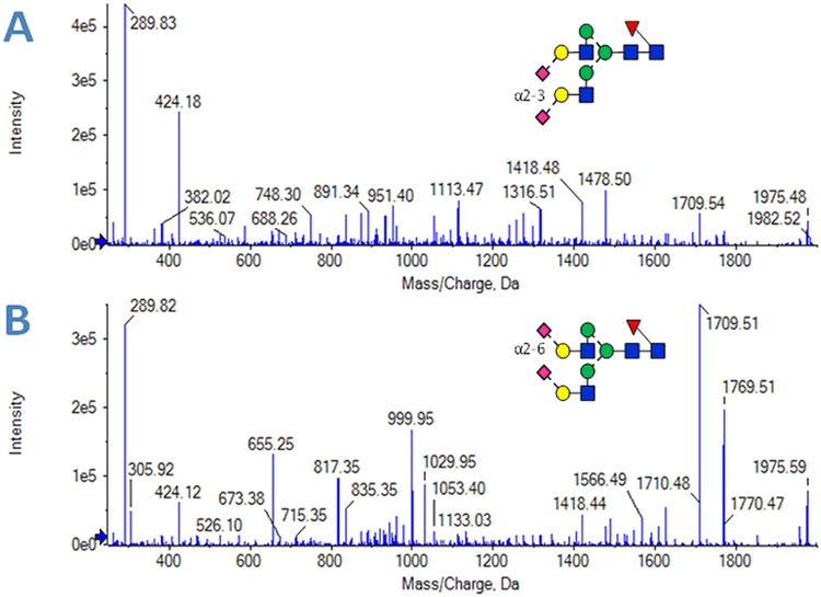 Following successful differentiation of sialic acid linkage in two small glycan pairs, the behaviour of a pair of much larger di-sialylated biantennary glycans was attempted (Figure 1). Corresponding MS/MS data are shown in Figure 5. In addition to the 0,4A2-CO2 fragment ion at m/z 306, the prominent B3 ion at m/z 655 in the MS/MS spectrum of the α2,6 glycan is also thought to be diagnostic for this linkage.10