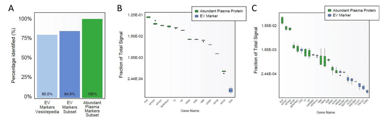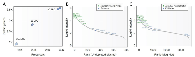 Sample preparation: Three different plasma centrifugation preparation methods were tested with samples of human plasma: the Early Detection Research Network SOP (1x1200g for 15 min), platelet-poor plasma (2x1500g for 10 min) and platelet-rich plasma (2x400g for 10 min). The preceding three plasma preparation techniques were analyzed further by LC-MS without any additional enrichment or depletion. In parallel, simultaneous enrichment of membrane-bound particles and depletion of abundant plasma proteins was carried out using MagReSyn strong anion exchange (SAX) beads as previously described 1. Automated Mag-Net enrichment, extraction, digestion and Evotip loading were performed on 4 µL of prepared plasma samples using an Opentrons OT-2 robotic liquid handling system. Technical replicates were prepared for all samples in a 96-well plate format on the Opentrons system.