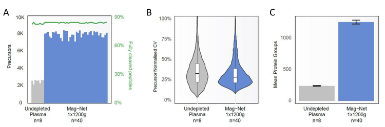 To further validate the reproducibility of the automated plasma workflows, a set of sample preparations using both the undepleted and Mag-Net enrichment methods were performed, followed by Zeno SWATH DIA analysis using the 200 SPD method. Precursor and protein group identifications are summarized in Figure 3. The identified precursors increased from approximately 2,000 with undepleted plasma to >8,000 with Mag-Net enriched plasma. The quantitative reproducibility also improved with Mag-Net enrichment: Figure 3B shows that the median CV for identified precursors decreased following Mag-Net enrichment, with a tightening of the overall distribution. The number of protein groups identified increased from approximately 250 with undepleted plasma to >1,200 with Mag-Net enrichment at 200 SPD with Zeno SWATH DIA.