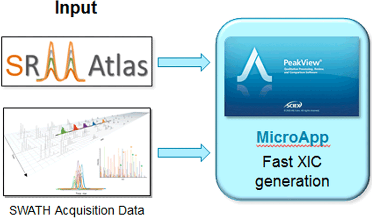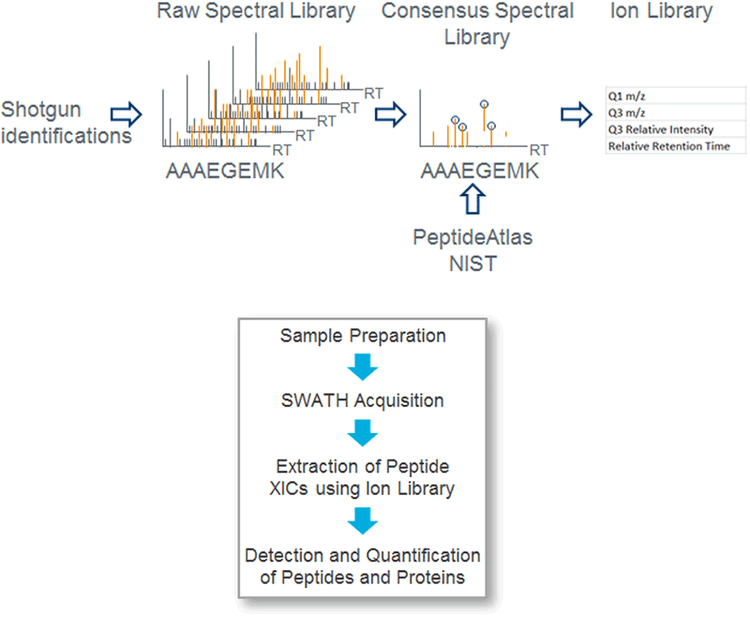 - Data is interrogated using qualified spectral ion libraries, which are libraries of peptide MS/MS spectra and known retention times. Peptides are detected and extracted ion chromatograms of the fragment ions are generated for quantitation