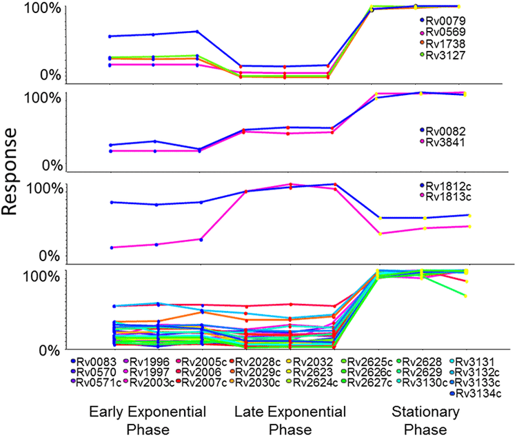 Of the 49 genes in the DosR regulon, 33 of these proteins were quantified in this study (Figure 8). As expected, the quantitative profiles of the majority of the dosR targets show a higher abundance in the stationary phase over the other points in the growth curve. Some proteins however were found to have different expression patterns as show in Figure 8.