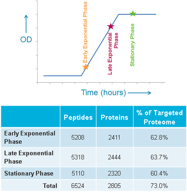 In order to show that SWATH Acquisition allows quantitative profiling of an entire biological system, we monitored the protein abundance changes between three discrete time points along the growth curve. Samples were collected at early exponential, late exponential and stationary growth phase, lysed and digested with trypsin and then analyzed by three technical replicates. From the SWATH Acquisition data, targeted and reproducible chromatographic traces were extracted for over 5,100 peptides covering in total 2,805 proteins (73% of the proteome) (Figure 4).