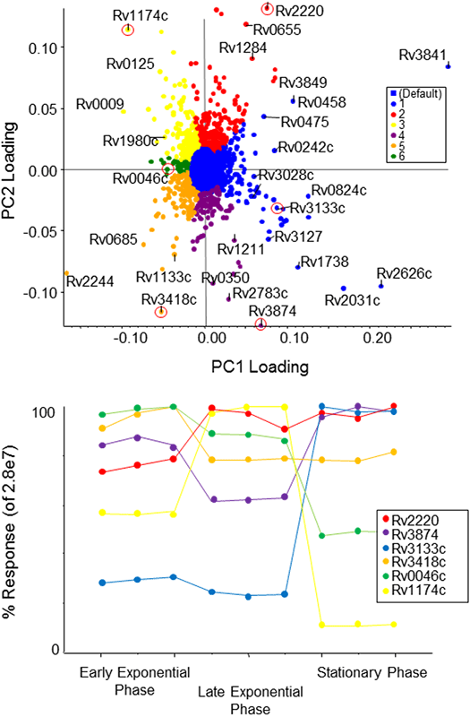 After PCVG analysis, the similarly clustered proteins appear on the Loadings plot with the same color (Figure 6, top). This simplifies exploration of the various protein behaviors; a representative protein out of each color group was selected (bottom). The blue protein selected is transcription factor dosR (Rv3133c), found up-regulated in stationary phase. In contrast, the green protein inositol 1-phosphate synthetase (Rv0046c) was found to decrease in abundance towards stationary phase. The purple and yellow clusters exhibit opposite expression patterns to each other, with yellow showing increased in late exponential phase and purple showing decreased expression.
